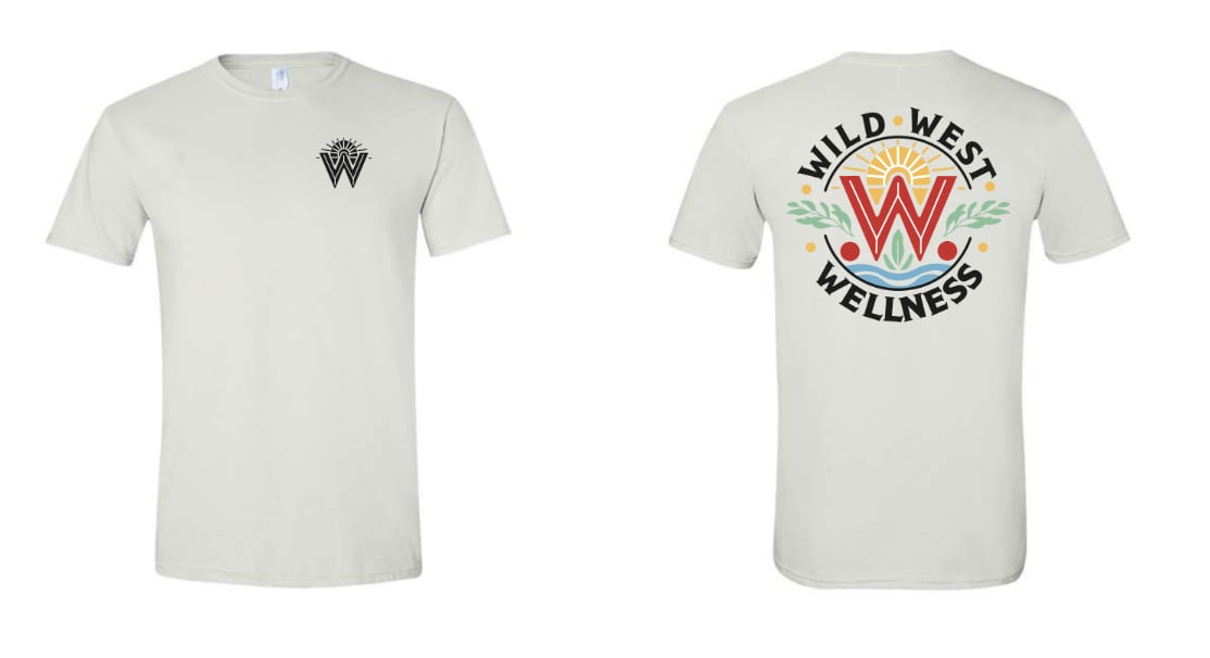 Show off your connection to nature and holistic wellness with this Wild West Wellness branded t-shirt! Designed for comfort and style, this soft, neutral-colored tee features a minimalist Wild West Wellness logo on the front and a bold, vibrant design on the back. The back graphic incorporates Indigenous-inspired elements, including a rising sun, flourishing greenery, and water, symbolizing balance, renewal, and the healing power of nature.
